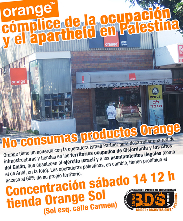 La compañía telefónica ORANGE es cómplice directa de la ocupación y el apartheid en Palestina. Concentración en su tienda de Sol (Madrid) el sábado 14 a las 12h.