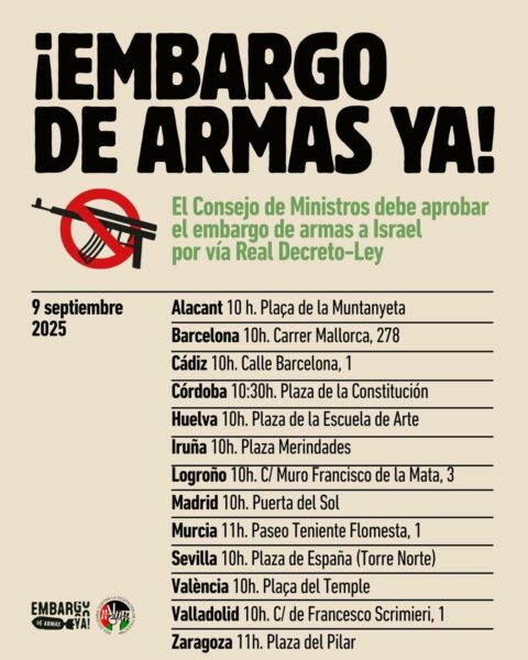 Animamos a más ciudades a unirse el día 9 de septiembre, para exigir con una sola voz la aprobación inmediata de un embargo integral de armas a Israel vía Real Decreto Ley.