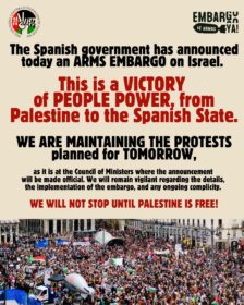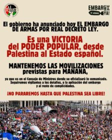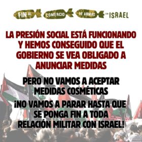 Aunque este anuncio llega muy tarde, ante las masacres indescriptiblemente horrorosas que lleva a cabo Israel en la Franja de Gaza y en toda Palestina, el anuncio de hoy supone un pequeño respiro que brinda esperanza y nos recuerda la importancia de las luchas populares. La comunicación de estas medidas no sería posible sin la lucha de cada una de nosotras. Queremos agradecer a todas las personas, colectivos, organizaciones, sindicatos, partidos políticos que luchan incansablemente para detener el comercio de armas con Israel. No vamos a parar hasta que se ponga fin a toda la complicidad y relaciones con el estado genocida de Israel, y toda Palestina sea libre.