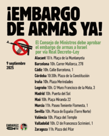 La Red Solidaria Contra la Ocupación de Palestina (RESCOP) y la Campaña “Fin al Comercio de Armas con Israel”, convocan movilizaciones ante las Delegaciones y Subdelegaciones del Gobierno de las principales ciudades del Estado español. El lema de las mismas será “Embargo de armas ¡YA!” y exigirán al Gobierno que adopte de manera inmediata un embargo integral de armas a Israel vía Real Decreto Ley.