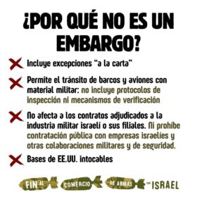 Por ello, hacemos un llamamiento a la sociedad civil organizada para seguir presionando al Gobierno para que se apruebe un embargo de armas integral y retroactivo, que sirva de ejemplo a otros países y permita cortar de forma efectiva el flujo de armas y dinero que alimenta a la industria armamentística israelí que sostiene el genocidio.