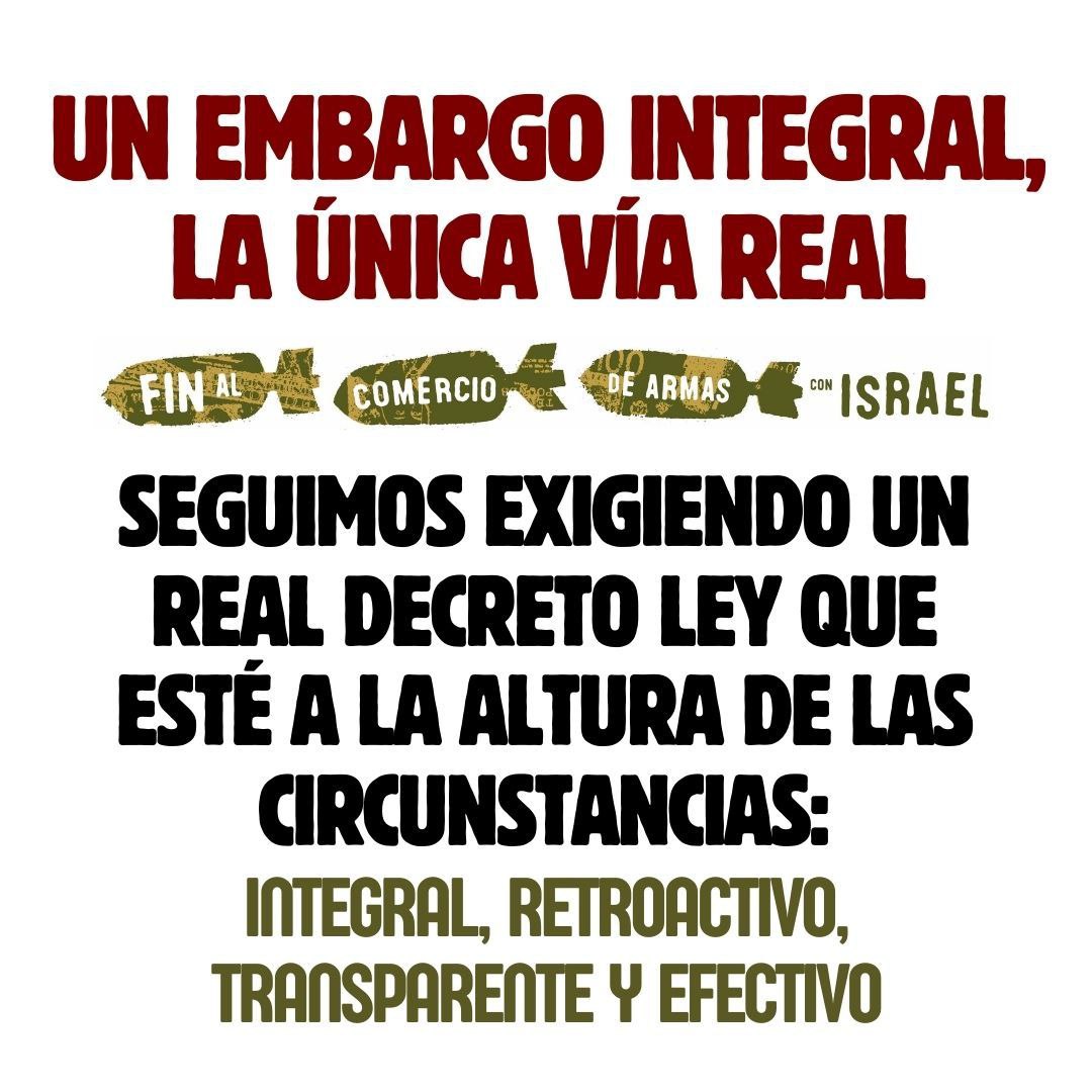 El Gobierno ha aprobado un Real Decreto Ley que supuestamente comportaría un embargo de armas a Israel. Tras examinar su articulado, concluimos que este texto NO constituye un embargo de armas. Tampoco responde a las demandas urgentes de la sociedad civil, a las obligaciones legales internacional ni a las necesidades del pueblo palestino. El texto incluye graves excepciones y no garantiza un blindaje real para poner fin al comercio de armas con Israel. Esta norma no supone un embargo: deja fuera elementos determinantes, regula de manera ambigua e incompleta y mantiene amplias grietas legales que permiten la continuidad de la complicidad con el genocidio.