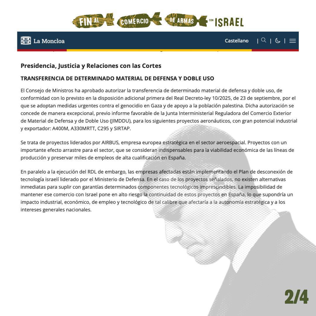 Esta decisión convierte en papel mojado el compromiso anunciado por el Ejecutivo y demuestra lo que ya venimos alertando desde hace meses: el RDL es un colador lleno de agujeros y ahora el Gobierno ha puesto en práctica el más peligroso, las excepciones. Lo decimos alto y claro: no pueden haber excepciones con un estado que está cometiendo un genocidio.
