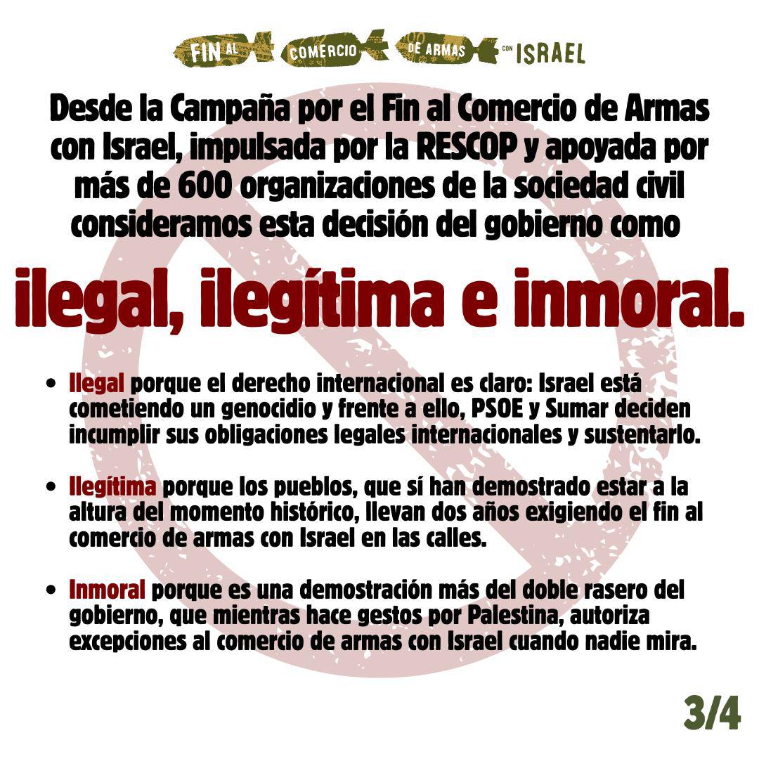 Inmoral, porque evidencia el doble rasero del Gobierno: mientras realiza gestos públicos de apoyo a Palestina, autoriza excepciones al comercio de armas con Israel cuando nadie mira, anteponiendo intereses económicos e industriales a la vida de miles de personas.