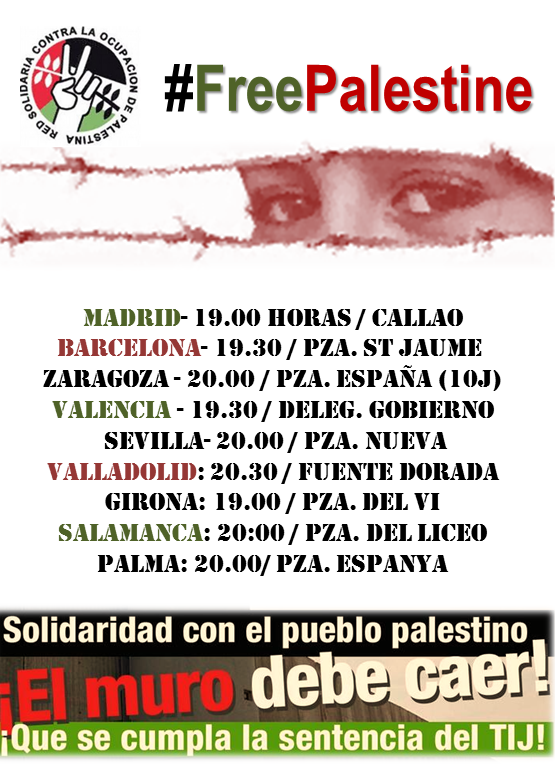 El jueves 17 de julio de 2014 habrá una manifestación en Madrid, a la par que en otras muchas ciudades del Estado, para exigir a Israel el cese del genocidio en Gaza y en solidaridad con el pueblo palestino. La convocatoria es a las 20h en Cibeles.