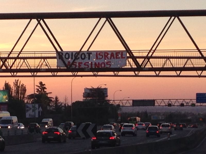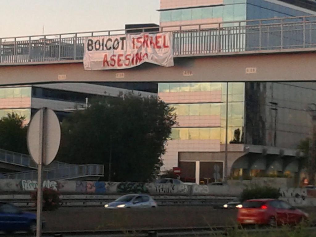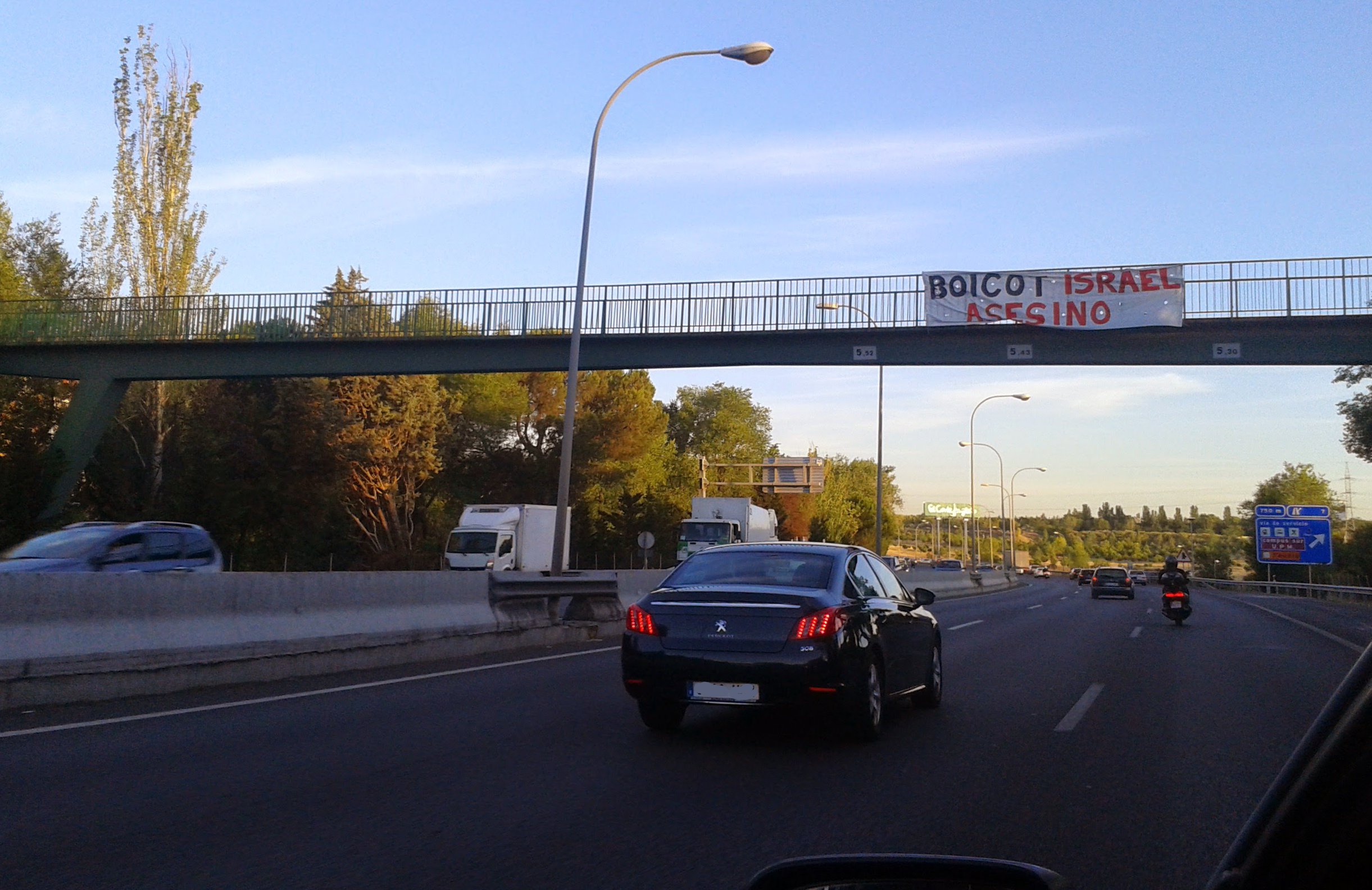 Esta mañana, Madrid ha amanecido boicoteando a Israel. En las entradas a Madrid desde las autovías A1, A3 y A6, pancartas con el mensaje «boicot Israel asesino» aparecieron en varios puentes de acceso a la capital. Los automóviles incluso redujeron la velocidad para leer el mensaje.