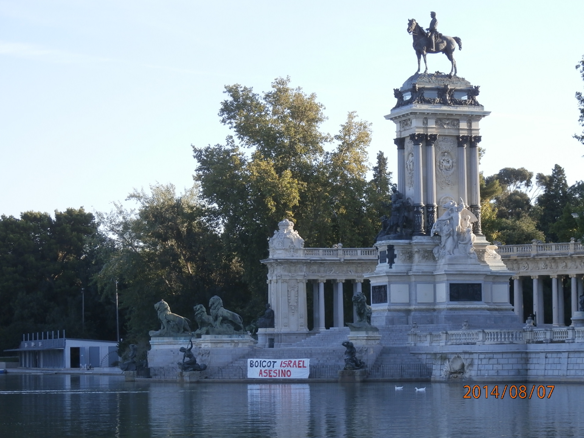 En el Parque del Retiro de Madrid, al borde del lago, a los pies del monumento a Alfonso XII, otra pancarta también llamaba a la ciudadanía a boicotear los productos israelíes, como medida de presión para obligar a este estado a cumplir con la legalidad internacional. Los madrileños y madrileñas que paseaban esta mañana a las orillas del estanque, mostraron respaldo a la iniciativa. Una señora declaraba que “ojalá pudiéramos aislar a Israel por sus crímenes atroces contra la infancia palestina”.