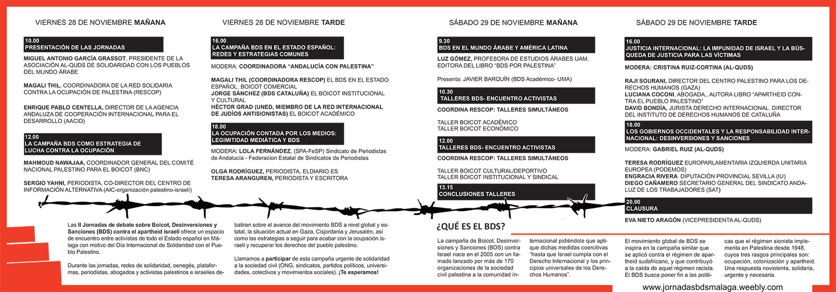 Tras la exitosa I Conferencia Estatal por el BDS de Barcelona de 2012, los próximos días 28 y 29 de noviembre la Asociación Al Quds organiza en Málaga las II Jornadas de debate sobre la Campaña BDS (Boicot, Desinversión y Sanciones) contra el Apartheid Israelí.