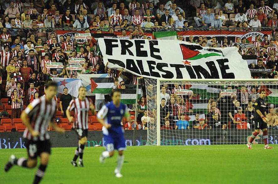 Solidaridad con Palestina y carteles de boicot a Israel en Bilbao en un partido contra el Hapoel.