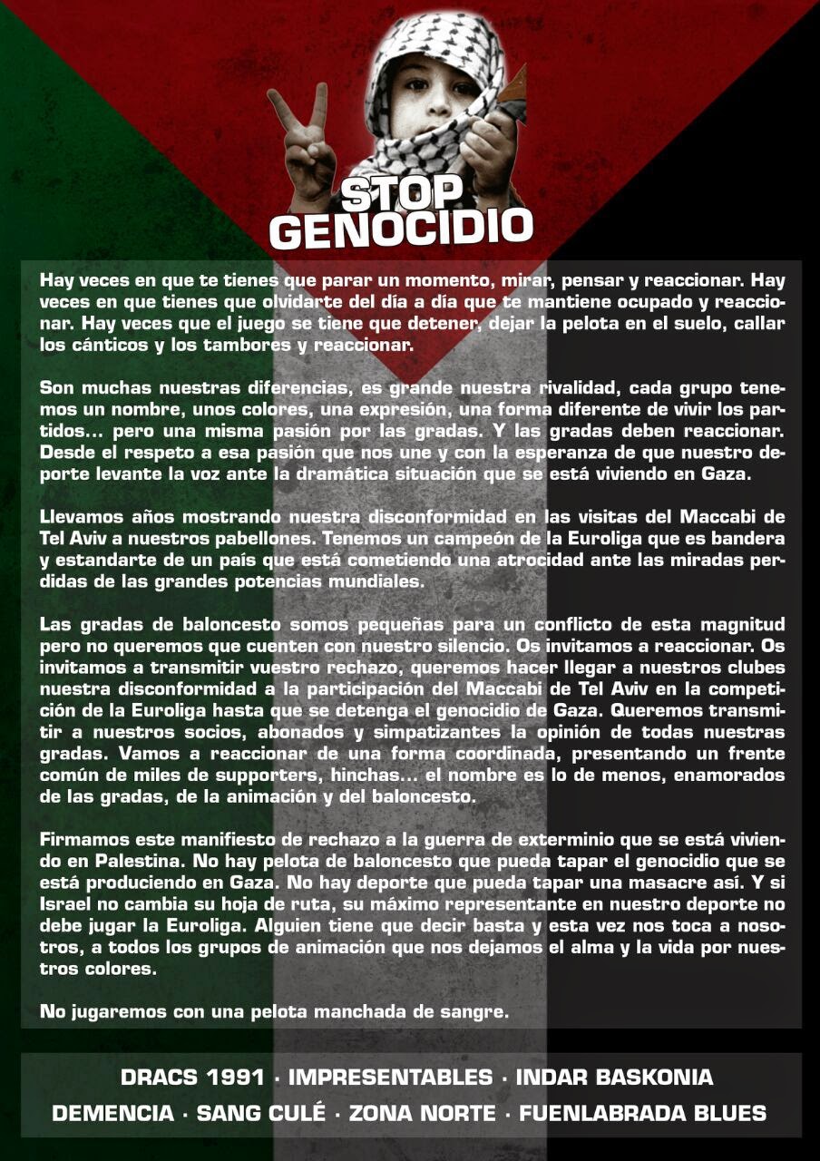 Por ello, en apoyo a la campaña BDS lanzada por la población palestina, reafirmamos nuestra solicitud anterior.