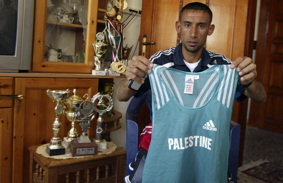 Nader Masri muestra la camiseta con la que compitió en Beijing 2008. (AP Photo/Majed Hamdan)