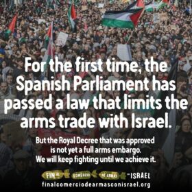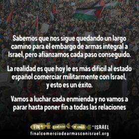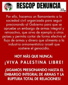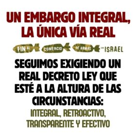 Por ello, hacemos un llamamiento a la sociedad civil organizada para seguir presionando al Gobierno para que se apruebe un embargo de armas integral y retroactivo, que sirva de ejemplo a otros países y permita cortar de forma efectiva el flujo de armas y dinero que alimenta a la industria armamentística israelí que sostiene el genocidio.