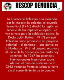 La historia de Palestina está marcada por la imposición colonial: el acuerdo Sykes-Picot (1916) dividió la región al servicio de los imperios europeos, sin voz ni voto para la población nativa; la Declaración Balfour (1917) entregó Palestina como promesa a un proyecto colonial —el sionismo— que derivó en la Nakba de 1948, el despojo masivo y el inicio de la ocupación que hasta hoy continúa. En 1947 las potencias internacionales impulsaron sobre Palestina el plan de partición de la ONU trazando fronteras sobre su tierra sin el consentimiento de su pueblo.