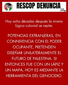 Hoy ocho décadas después la misma lógica colonial se repite: potencias extranjeras, en connivencia con el poder ocupante, pretenden diseñar unilateralmente el futuro de Palestina. Si entonces fue con un lápiz y un mapa, hoy es mediante la herramienta del genocidio.