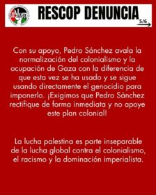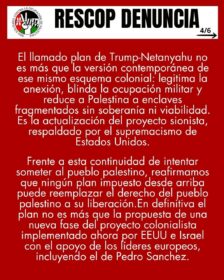 Frente a esta continuidad de intentar someter al pueblo palestino, reafirmamos que ningún plan impuesto desde arriba puede reemplazar el derecho del pueblo palestino a su liberación.En definitiva el plan no es más que la propuesta de una nueva fase del proyecto colonialista implementado ahora por EEUU e Israel con el apoyo de los líderes europeos, incluyendo el de Pedro Sanchez.