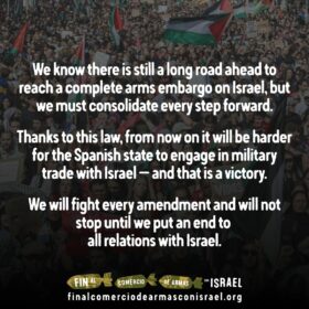 Pero NO es un embargo de armas integral y no responde a la situación de extrema gravedad y urgencia en Palestina: por eso exigimos a todos los partidos políticos que voten en el Congreso su conversión y que añadan las enmiendas exigidas para así garantizar un embargo integral, sin excepciones, transparente, y que ponga fin definitivamente a todas las relaciones militares y de seguridad con Israel. Es incomprensible que los partidos políticos se solidaricen con Palestina y que no legislen y presionen para acabar con ABSOLUTAMENTE TODO el comercio de armas con Israel.