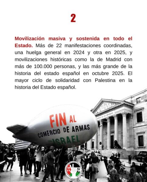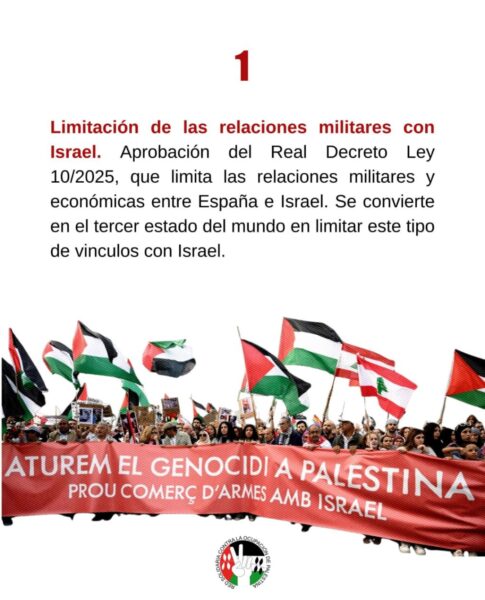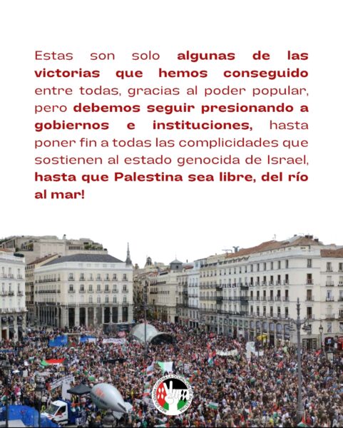 El gobierno del Estado español ha empezado a tomar medidas, pero son totalmente insuficientes. Esto nos demuestra que la presión popular funciona, que la lucha funciona, y por eso debemos aumentarla. Gracias a nuestra presión, a salir mes tras mes a las calles a veces hasta en más de 100 municipios en un mismo fin de semana, el Gobierno ha aprobado un Real Decreto Ley que es un paso hacia el embargo de armas a Israel.