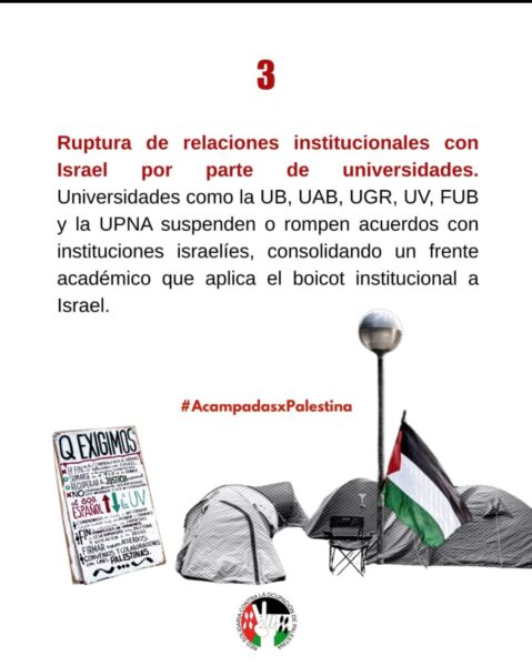 El 28 de mayo de 2024 la Universidad de Valencia aprueba una moción que dice: «no firmará ningún acuerdo ni convenio de colaboración con instituciones, universidades y centros de investigación de Israel mientras no acaben los crímenes de lesa humanidad contra el pueblo palestino».
