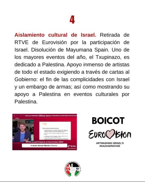 Tras la vergonzosa postura de la UER en su asamblea del 4 de diciembre, protegiendo a Israel, RTVE anunció su retirada de Eurovisión, que tampoco retransmitirá,al igual que las cadenas de Países Bajos, Irlanda y Eslovenia.