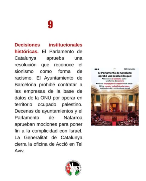 Nuestra lucha incansable empieza a dar frutos. Instituciones, administraciones y empresas empiezan a poner fin a su complicidad con el Estado genocida de Israel. Pero queda un largo camino por recorrer juntas. Recordemos todo lo que hemos conseguido en 2025 para seguir luchando con fuerza el 2026.